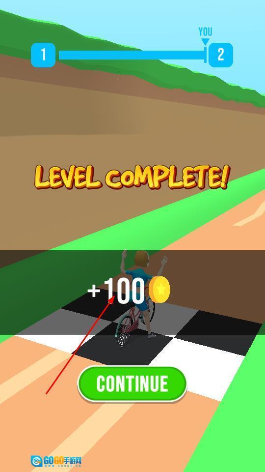 3、到达终点后会触发LEVEL COMPLETE提示,领取金币奖励,点击CONTINUE按钮即可进入下一关,解锁全新赛道,迎接更具挑战性的骑行任务。