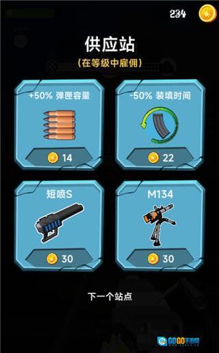 3、通关之后,在进入下一个关卡之前可以选择补给,选项包括弹夹容量提升、装填时间缩短以及各类枪支等。