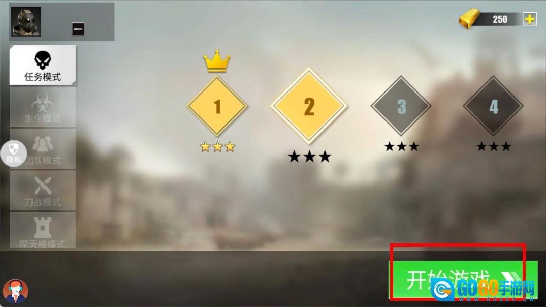 1、进入任务选择模式后,会显示关卡1、关卡2等选项,点击右下角的绿色开始按钮,就能进入对应关卡的战斗场景。