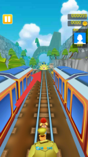 2、展现出经典的轨道跑酷画面,包含列车、角色、追击的保安,以及金币、分数显示等要素,玩家通过操控角色避开障碍、拾取道具来不断前行。