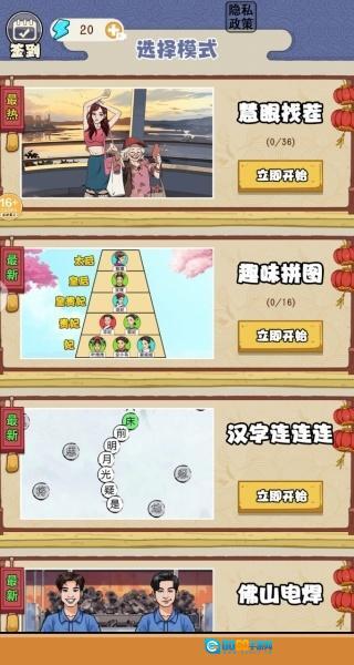 1、启动游戏后,第一步是选择模式,可选的有慧眼找茬、趣味拼图、汉字连连连等。