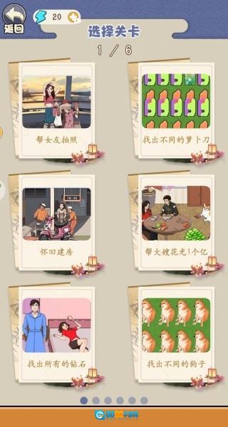 2、以慧眼找茬为例,接下来挑选关卡时,会看到帮女友拍照、找出不同的萝卜刀、怀旧建房等多种选择。