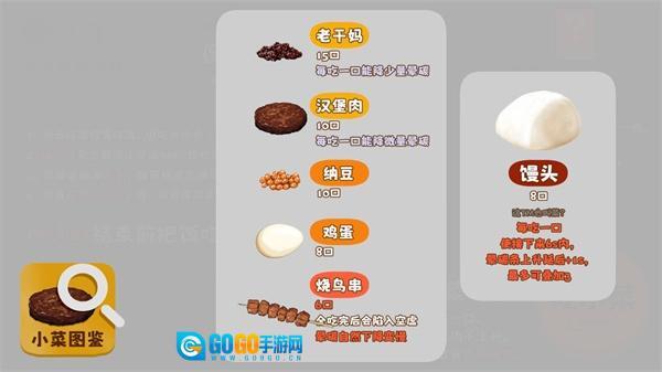 这里有好几种小菜,像鸡蛋、汉堡肉、馒头之类的,每种小菜的用途都不一样,可得好好搭配着用呀。