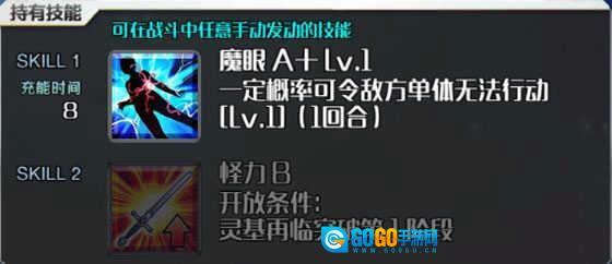 一技能:魔眼A+概率赋予敌单体麻痹状态(一回合)