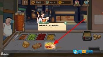 3、食材备好后,按照后续给出的提示,把面饼向上卷起,将食材包裹在里面,以此完成烤肉美食的制作,要保证整个制作过程符合规定的流程。