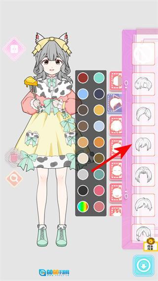 3、进入装扮选项后,找到红色箭头所指的颜色选择器并点击,从中挑选喜欢的颜色样式,将其应用到角色的发型等部位,同时可对外观细节进行调整。