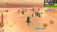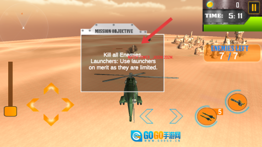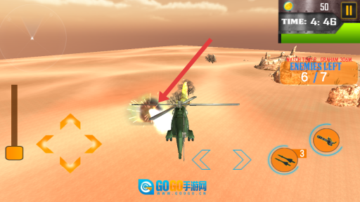 2、操作直升机,点击武器按钮攻击地面敌人,利用火力摧毁敌方目标,减少剩余敌人(ENEMIES LEFT)的数量。