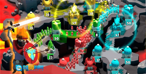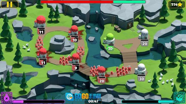 游戏玩法:总的来看,这款游戏的上手难度不高,操作起来很简单,只需要选择自己的城堡,再选定要进攻的目标就行,而且过程中可以同时选择多个目标。选定之后,士兵们就会源源不断地从城堡里出发,一直走到指定的地点。另外,屏幕左下方的能量条还能用来给士兵加速,或者提升他们的攻击力和防御力。