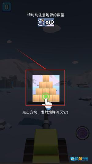 1、在游戏界面中点击红框标注的方块结构,每次攻击会消耗1枚炮弹,请注意左上角显示的剩余炮弹数量“X10”,并及时补充弹药。