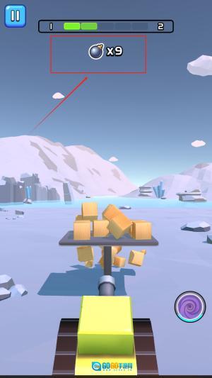 2、操作黄色推土机去收集场景里的银色球体道具(目前已持有9个),借助这些道具清理掉前方堆叠的木箱障碍物,以便继续向前推进。