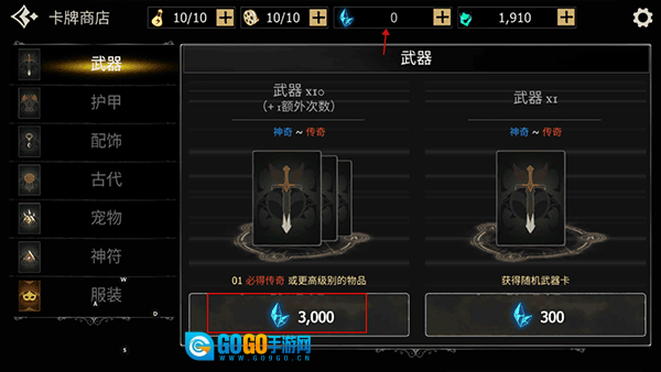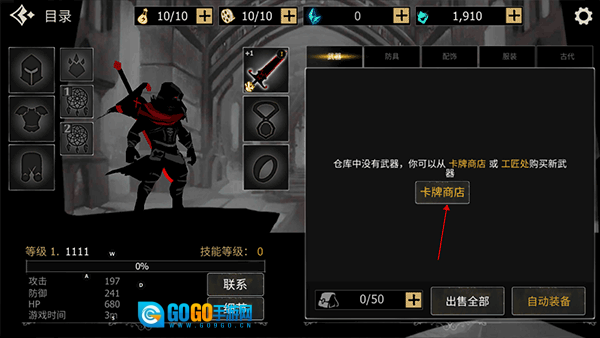 2、能看到我们背包里没有武器,接着会提示我们前往卡牌商店