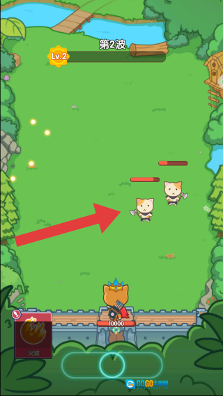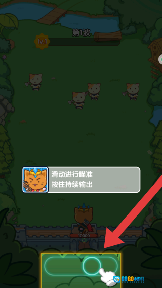 1、画面呈现出第1波敌人的进攻,依据下方的操作指引滑动来完成瞄准,按住即可持续输出,玩家需要操控头顶带有皇冠的小猫角色开展攻击与防御行动。