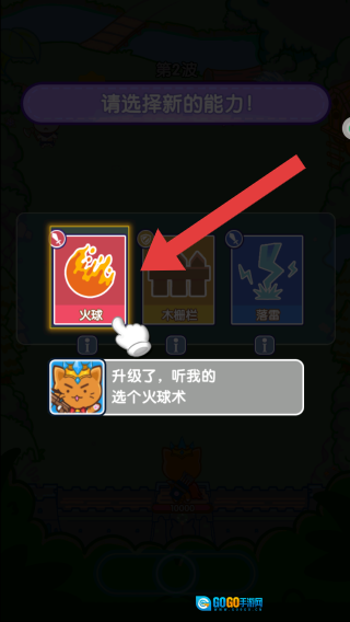 2、目前处于第2波阶段,需要选择新的能力,可选的有火球、木栅栏、落雷这几种,小猫这边建议选择火球术,它可以用来防御敌人的进攻。