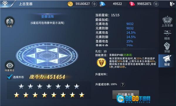 4、锻星:这是上古圣器所附带的法阵系统,借助锻星操作能够提升圣器法阵的星级,进而让使用者获得属性加成,同时还能激活特殊的法阵光环技能。