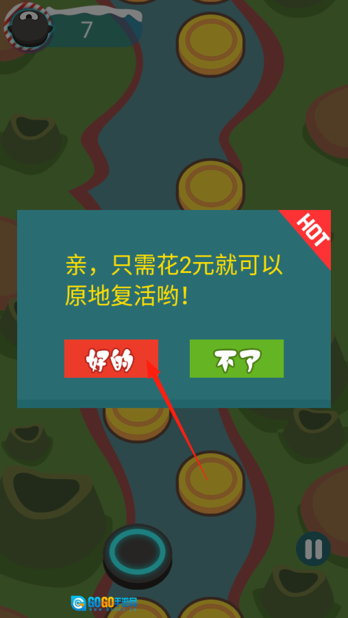 3、闯关过程中如果角色掉落导致失败,会弹出复活提示框。若想花费2元原地复活继续游戏,点击“好的”即可;若希望重新开始挑战,选择不复活就行,具体怎么继续游戏可以根据自己的心情决定。