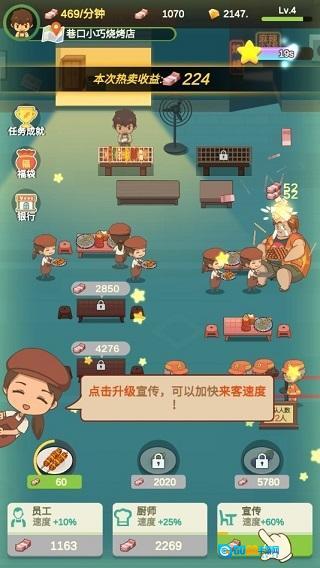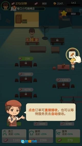 1、操作简便,惬意轻松:只需点击升级,就能解锁更多色香味美的烤品,还能提升服务员与厨师的等级,让食客们的味蕾得到充分满足。