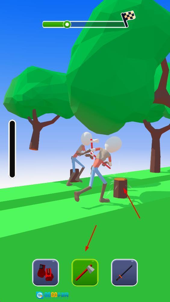 2、在游戏关卡内,切换至斧头武器,对树桩进行砍伐操作,以此获取分数或资源,从而推动游戏进度的提升。