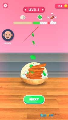 2、界面上方会显示顾客对配料的具体要求和所需数量,长按操作就能让食材落下,需要留意进度条并及时松手以防投放过量,之后便会进入下一项食材的摆放环节。