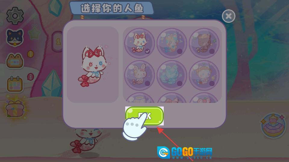 3、进入选择人鱼的界面后,浏览并选定想要的人鱼角色,接着点击绿色的OK按钮确认选择,这样就能正式开启关卡挑战,去探索海底世界的乐趣了。
