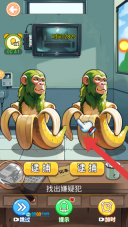 2、依据任务目标的提示:要找出嫌疑犯,场景中是两只被香蕉皮包裹的拟人化猴子,这属于找不同或推理辨别的关卡,需要通过找出猴子之间的差异来确定谁是嫌疑犯。