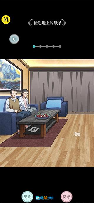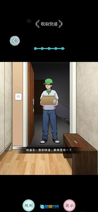 玩家需要点击门,再点击左侧的开关打开灯,接着把剪刀拖到快递上,最后点击里面的纸条,就能完成通关。