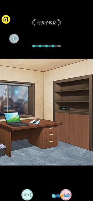 点击垃圾桶后,打开下方的抽屉,将里面的螺丝刀取出来放到电子表上;接着操作电子表,把时间调整到零点过几分的状态,之后点击房间的门,妻子就会出现。此时把她头上的发夹移到桌子上,再点击她手中端着的汤,等灯光闪烁一下,就去点击桌子下方的纸条,随后点击窗框上方的窗帘,再点击笔记本,等妻子回应后,点击那张宣传单,这样就能进入最后一关了。