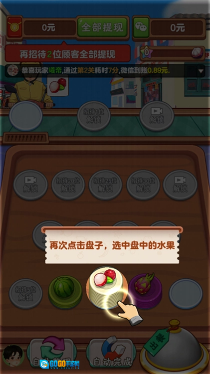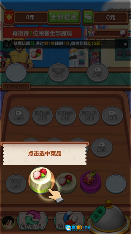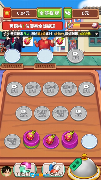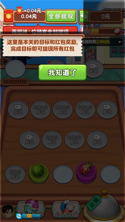 3、把搭配好的餐品递给外卖员,单次配送流程就完成了。通过对应的关卡后可以解锁红包奖励,累计到指定金额就能申请提现,并且还能解锁店铺升级的权限。