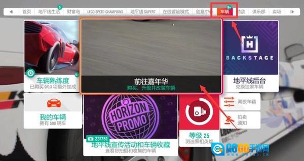 1、启动程序后进入主菜单界面,点击【我的车库】选项,接着在展开的菜单中选择【嘉年华活动中心】,即可进入创意内容枢纽页面。