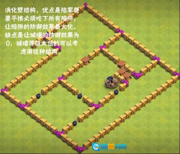 7、当城墙等级偏低,无法达到理想的防御效果时,就可以借助陷阱、开口来引导阵型,以上便是ClashofClans国际服布局阵型图的解析内容。