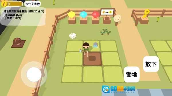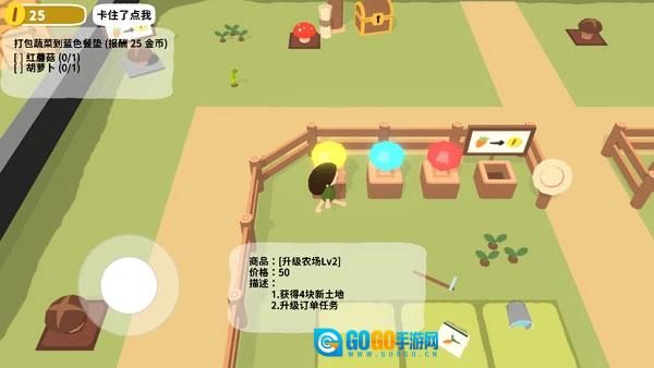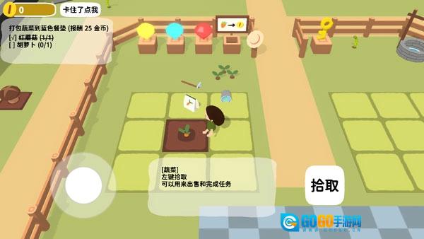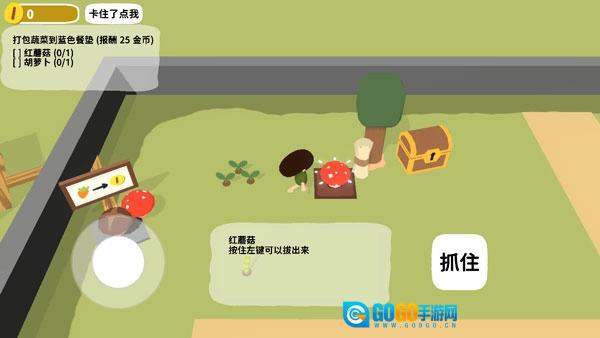1、打开黏脚菜园,进入游戏界面后,玩家首先要按照左上方的任务提示,拾取一个红蘑菇并放置到蓝色桌垫上;