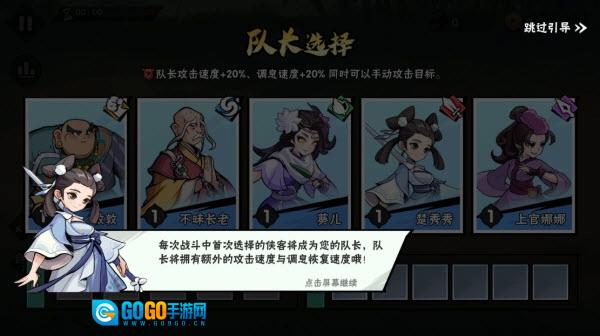 2、挑选一位队长,每次战斗里第一次选中的侠客会成为你的队长,队长能获得额外的攻击速度和调息恢复速度呢!