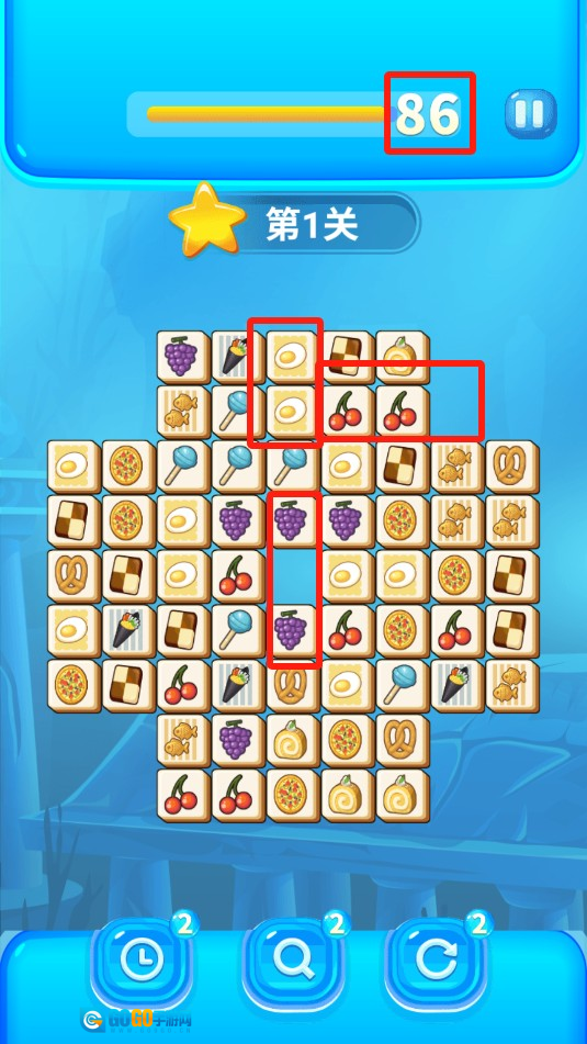 2、在关卡里,你需要点击两个相同的食品来完成消除操作,建议先点击距离近的,再去消除距离远的。