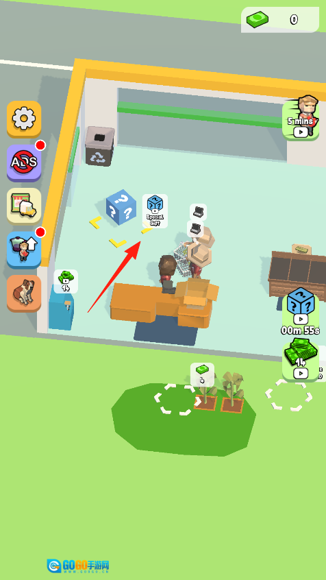 1、来到超市场景后,若看到地面上有带问号的方块,就点击箭头所指的那一个。点击打开后,能获取随机道具,比如金币、新物品之类的。借助这些道具,你可以在超市里完成购物任务,让逛超市的过程变得更有趣味。