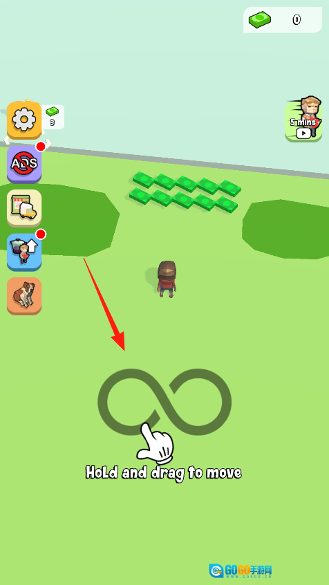 3、进入户外场景后,按照提示“Hold and drag to move”操作——长按屏幕并拖动,以此控制角色移动方向;朝着绿色钞票的位置前进,拾取钞票积累财富,同时探索整个场景,完成收集类的闯关任务。