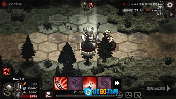 4、在行进途中遭遇敌人时会触发战斗,界面中间的四个图标对应角色的技能,每个技能都具备不同的作用范围,待敌人被全部消灭后,战斗即可结束。