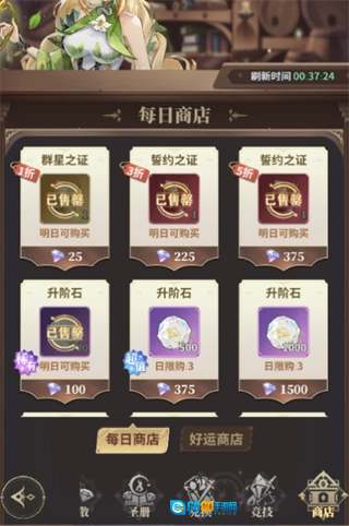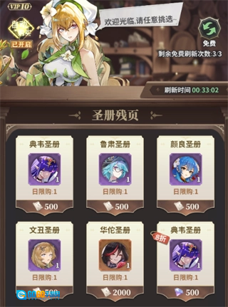 每日商店的商品建议尽量全部购买,特别是抽卡券一定要入手;升阶石可以根据钻石剩余量来决定是否购买。好运商店每天有5次免费刷新的机会,可以手动去寻找自己急需的道具;如果钻石比较充足的话,还可以开启自动购买功能。圣册商店里,前期建议把紫色圣册拉满——因为后续橙色、红色圣册升星的时候,都需要消耗大量的紫色圣册作为“狗粮”。