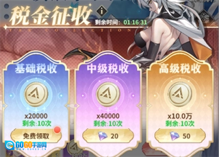 开服第一周一定要把税收次数用满!金币和钻石税收各10次是限时福利,到了游戏后期,武姬升阶和装备强化会非常依赖这些资源。