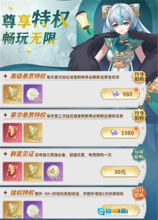 高级悬赏特权与豪华悬赏特权强烈建议入手——用钻石支付且一旦购买永久有效。开启之后,主线悬赏任务里高品质的内容会刷新得更频繁,还能产出英雄碎片、钻石和金币,性价比特别高。
