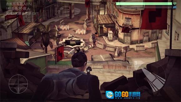 3、进入关卡后,左侧为移动视角区域,右侧是射击按钮,关卡目标会在左上角展示。