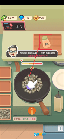 5、来到调味区域后,把所需的调料添加到锅里,要留意用量的准确性,同时让箭头对准进度条的中间位置。