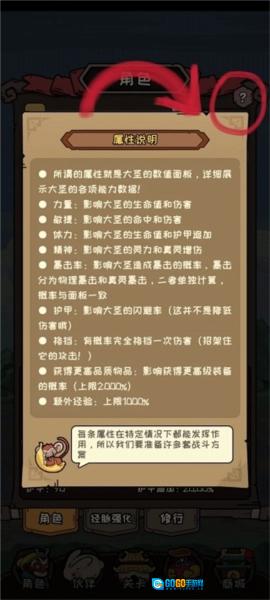 1、进入游戏主界面后,打开【角色】板块,点击该界面右上角的问号按钮,即可详细查看大圣的各项能力数据。
