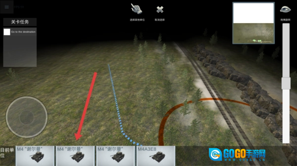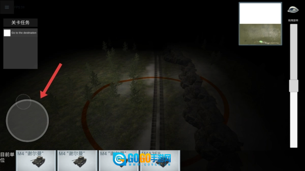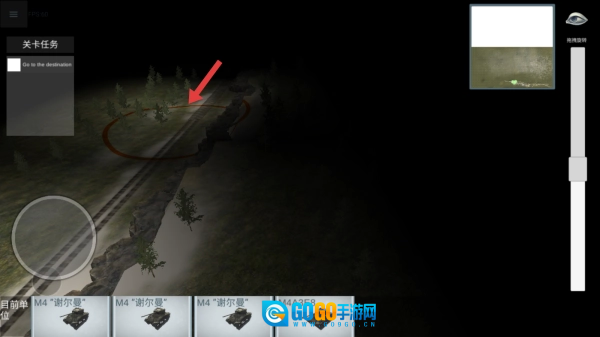 1、进入关卡后,查看关卡任务是Go to the destination,借助小地图右上角的指引,通过左侧轮盘操控部队,沿着铁路方向推进。