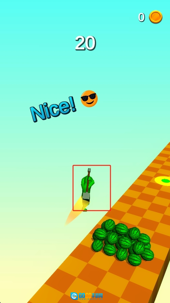 2、小人接触到西瓜堆后,需持续进行操作,使其用斧头砍击西瓜;当触发加速效果时,借助这一速度快速前进,同时避开障碍物,并维持砍瓜的节奏。