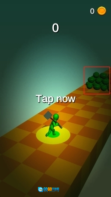 进入作品后,一旦看到点击提示,就立刻点击屏幕,使手持斧头的绿色小人开始移动,朝着右侧的西瓜堆跑去,为砍碎西瓜获取分数做准备。