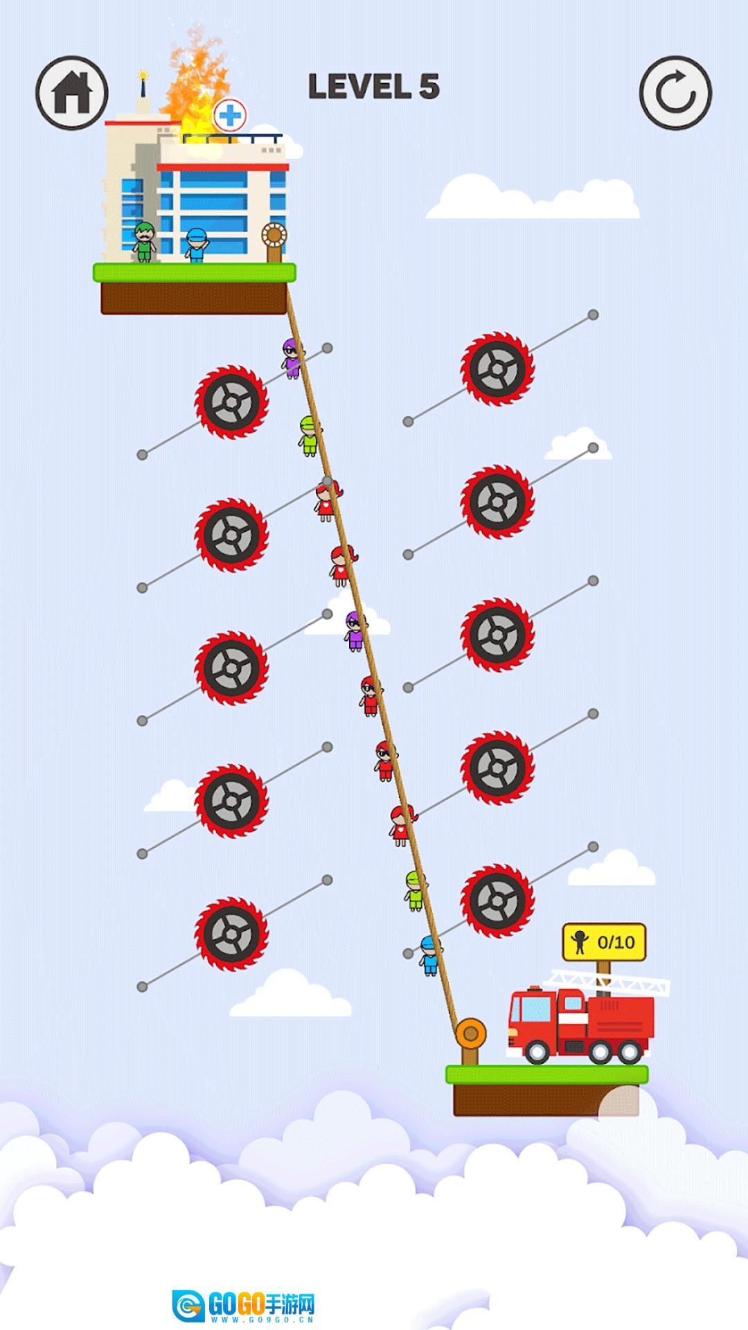 这款游戏采用简单轻松的休闲玩法,玩家需要借助各类绳索来完成人员救援任务。在闯关过程中,必须确保火柴人的安全,避免其受到任何伤害。