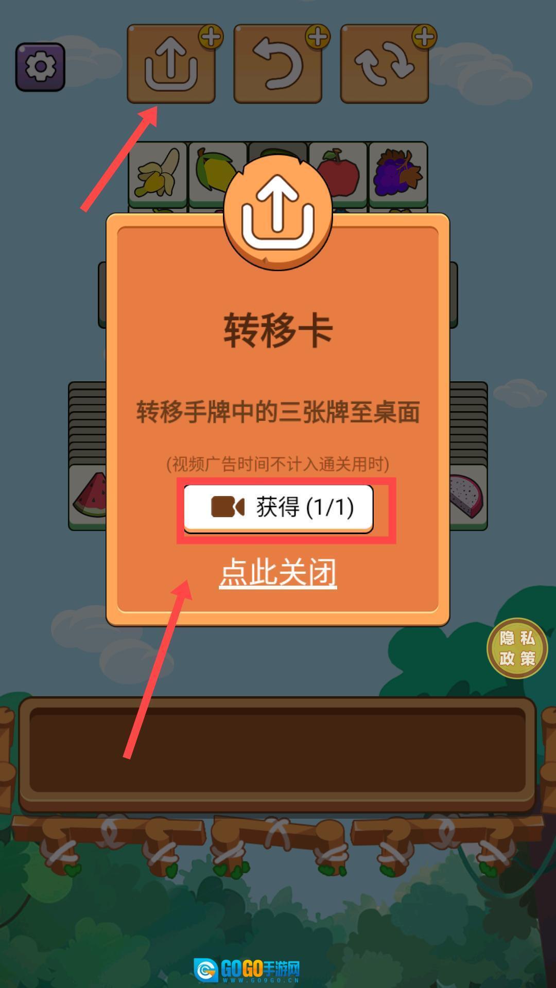 3、当玩家遇到转移卡弹窗时,点击“看广告获取”按钮即可获得转移卡;使用该转移卡能够将三张手牌转移至桌面,从而帮助玩家顺利通关。