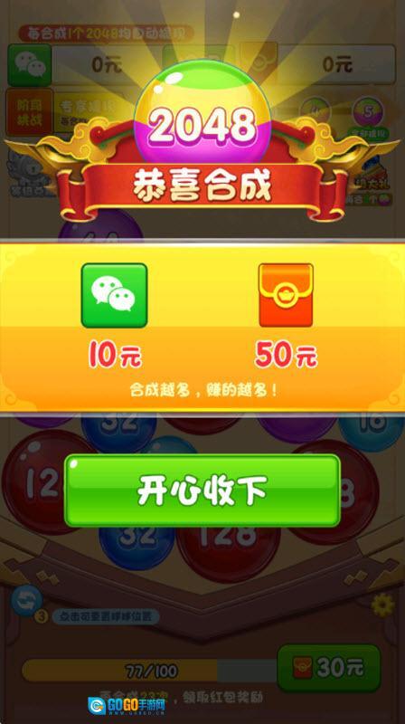天赐鸿福赚钱游戏是一款把经典2048玩法和财神主题巧妙融合的合成类小游戏,其玩法和经典2048游戏相近。玩家需点击相邻的同色小球来完成合成,以此得到等级更高的小球,最终要达成合成2048彩球的目标。游戏里还设有合成任务,玩家只要完成规定次数的合成操作,就能获取对应的奖励。