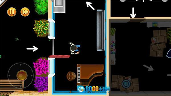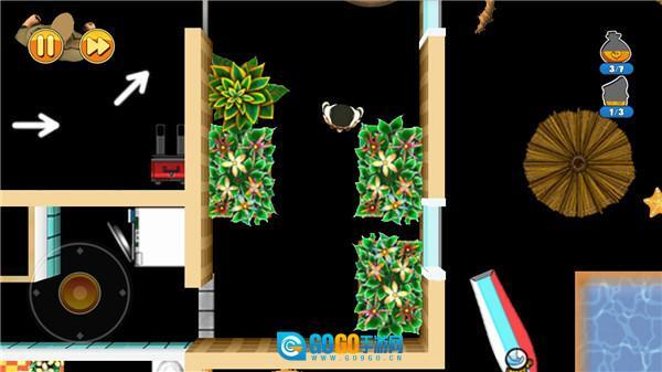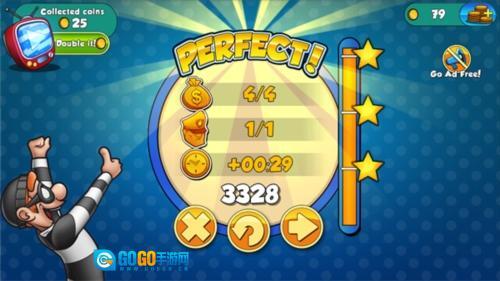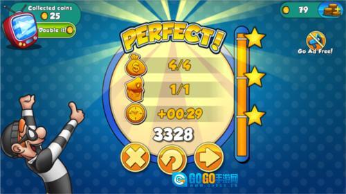 3.游戏的每一关都设有对应的任务要求,任务类型分为三种:收集场景里的养老金、避开人们的视线、在规定时间内完成任务并顺利撤离。关卡结束后,系统会依据玩家在这三项任务中的表现给出相应评价。前两个任务完成起来相对简单,时间方面只要玩家操作足够迅速也并非难事。随着游戏的推进,场景中出现的元素会越来越多,甚至还会出现一些需要玩家的机关才能顺利通关,这时候就需要考验玩家的操作技术了。不过玩家可以借助道具来帮助自己过关,每种道具都有其独特功能,具体如何使用就要看玩家的智慧了。