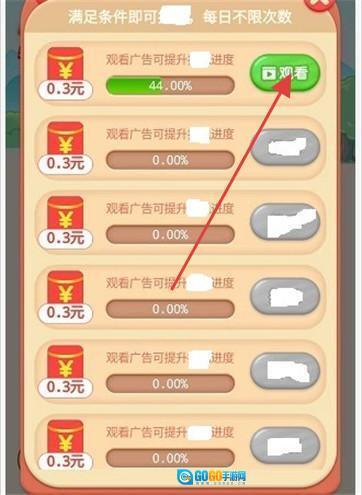 2、进入奖励页面后,点击“观看”广告按钮,进度条会随之提升,当进度满足要求时,即可领取对应的现金奖励(例如0.3元)。