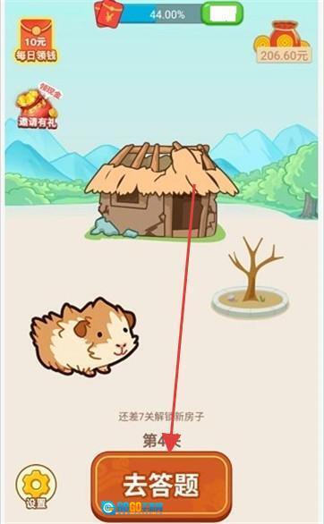 1、进入初始界面后,点击“去答题”按钮参与答题闯关,每完成一个关卡就能推动“翻新房子”的进度。